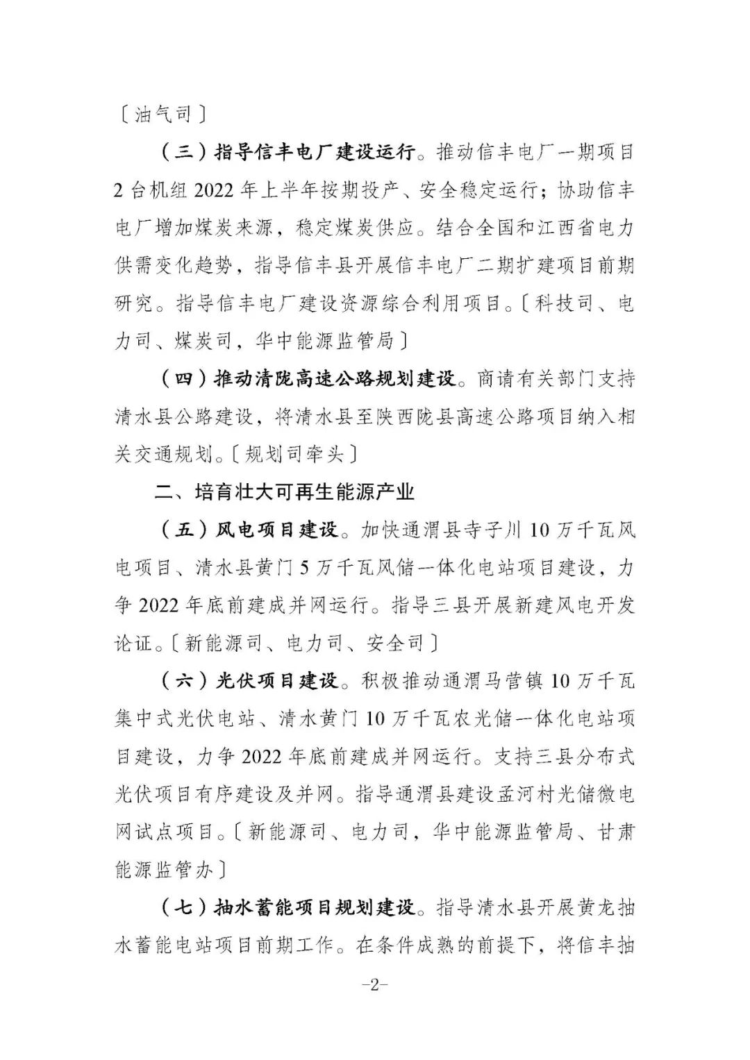 培育壮大可再生能源产业。推动光伏项目建设,积极推动通渭马营镇10 万千瓦集中式光伏电站、清水黄门10 万千瓦农光储一体化电站项目建设,力争2022 年底前建成并网运行。支持三县分布式光伏项目有序建设及并网。指导通渭县建设孟河村光储微电网试点项目。